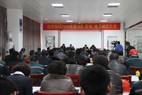 2月7日,為推進2014年度戰略目標順利實施,經典集團隆重召開項目、營銷、施工動員大會。集團公司高層領導苗樹文、杜福生、鄭建康、司紅玲、鄭利昌、高建國出席了此次會議,集團公司有關部門負責人、項目經理、營銷人員、施工隊長、生產車間負責人等80余人參加了此次大會。