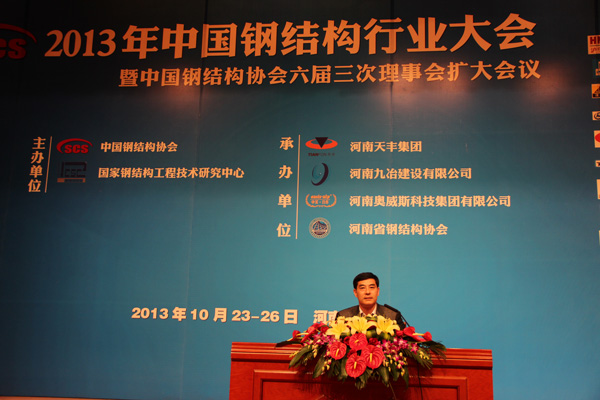 10月23日-26日,“2013年中國鋼結構行業大會暨中國鋼結構協會六屆三次理事會擴大會議”在河南鄭州黃河迎賓館召開。會議由中國鋼結構協會、國家鋼結構工程技術研究中心主辦;河南鋼結構協會等單位承辦。會議邀請了國務院國資委行業協會聯系辦公室副主任張濤、河南省人大常務委員會副主任儲亞平、中國鋼鐵工業協會常務副會長朱繼民、中國鋼結構協會會長(中冶建筑研究總院院長)岳清瑞、常務副會長劉毅、副會長賀明玄、秘書長劉萬忠及副會長、常務理事單位等出席會議。經典集團董事長苗樹文、生產總經理王忠策等公司領導參加了此次大會,經典集團榮獲中國鋼結構協會第六屆理事會理事單位,苗樹文董事長為中國鋼結構協會第六屆理事會理事。