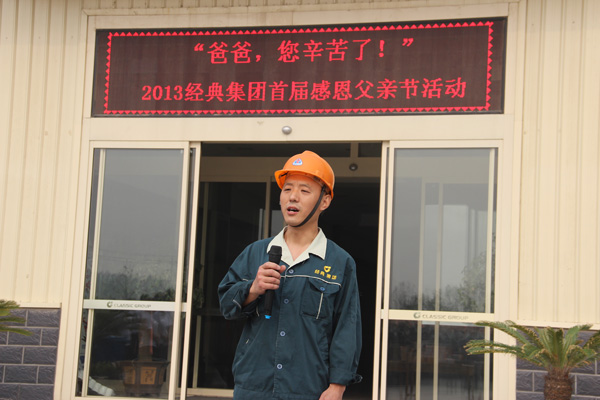 2013年6月16日上午7點30分,經典集團開展2013年度父親節“送溫暖,獻愛心”活動,為集團全體員工的父親送上愛心手機,千元節日紅包,集團董事長苗樹文,總經理杜福生及高層領導先后致辭并發放獎金及手機?;顒优e行完后,經典集團總經理杜福生親自到部分員工家中為員工父親送上集團的問候與節日祝福。
